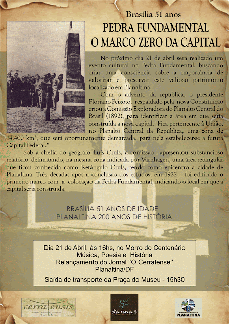 MÚSICA, POESIA E HISTÓRIA, Com os grupos teatrais Quebrando O Gelo e Trupe Por Um Fio, o Projeto Pau-Pereira com Samba de Roda e Makulelê, declamação do poeta Luis Felipe Vitelli e um abraço à Pedra Fundamental ao som do sax de Israel Colona, tocando o Hino de Planaltina e música em homenagem à Brasília.